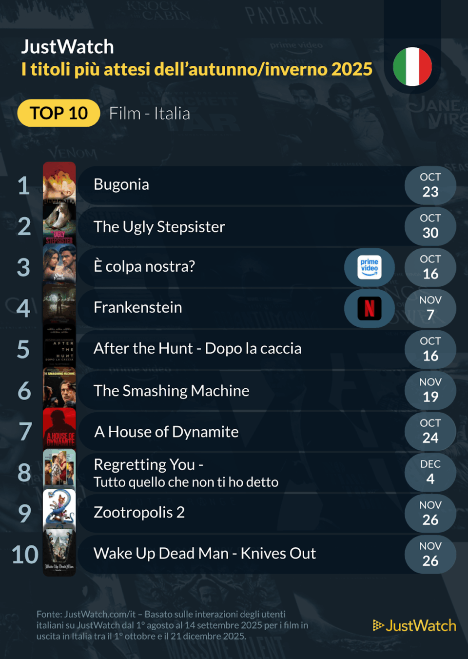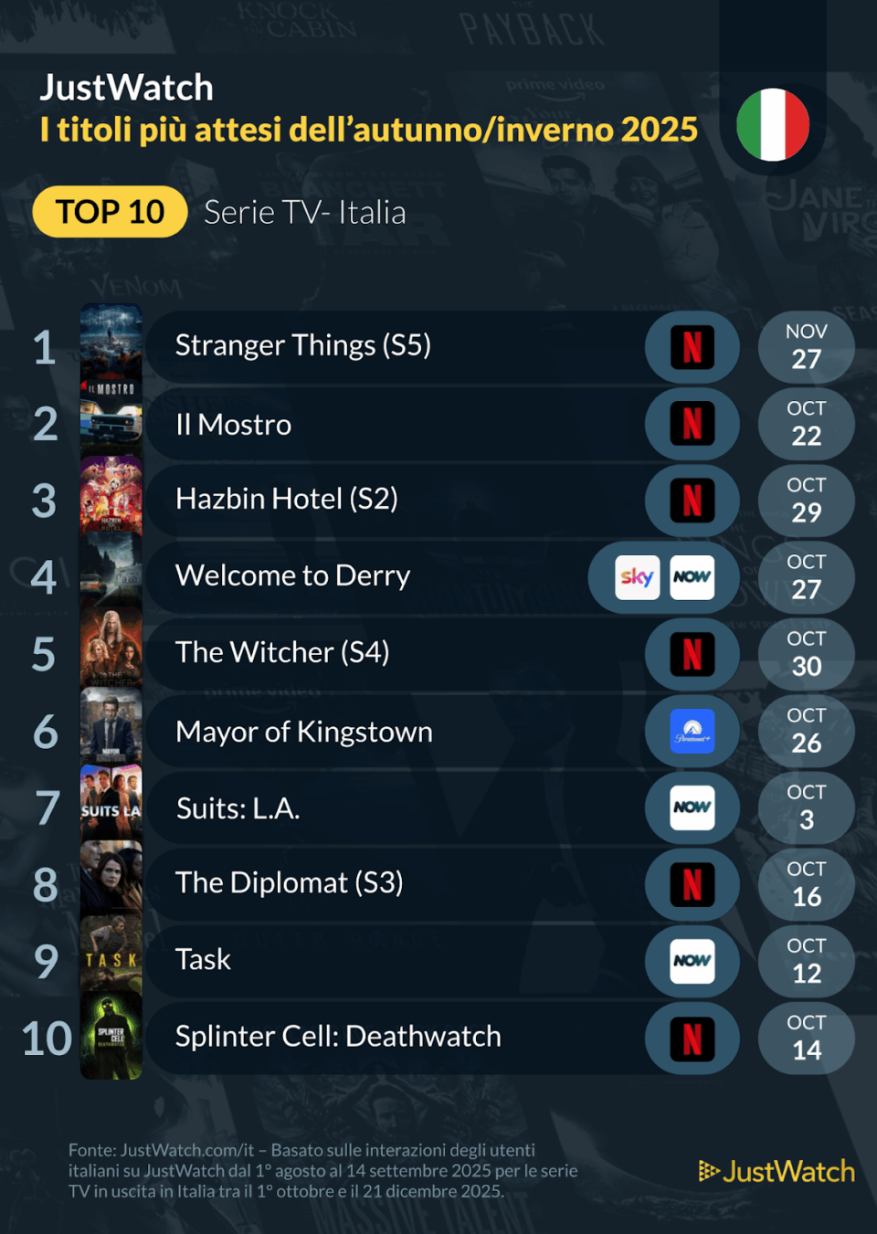 Per tutti coloro che non vedono l’ora di mettersi comodi sul divano con la classica copertina, JustWatch, la più grande guida al mondo di contenuti in streaming, ha pubblicato la classifica dei film e delle serie tv più attese in Italia di questi autunno e inverno 2025.