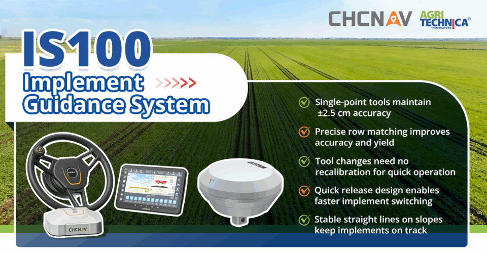 IS100 (Guida Attrezzo): Utilizza la posizione effettiva dell’attrezzo come riferimento per eliminare la deriva, migliorando significativamente la distanza tra le file e la rettilineità — soluzione ideale per pendii, colline e attrezzi trainati.